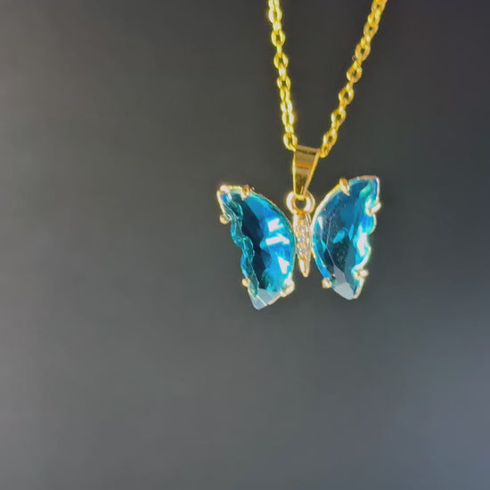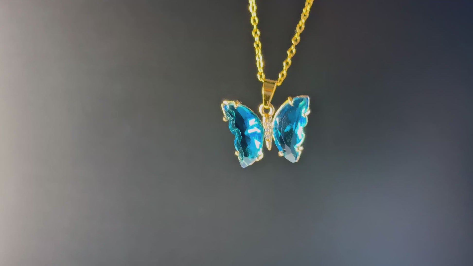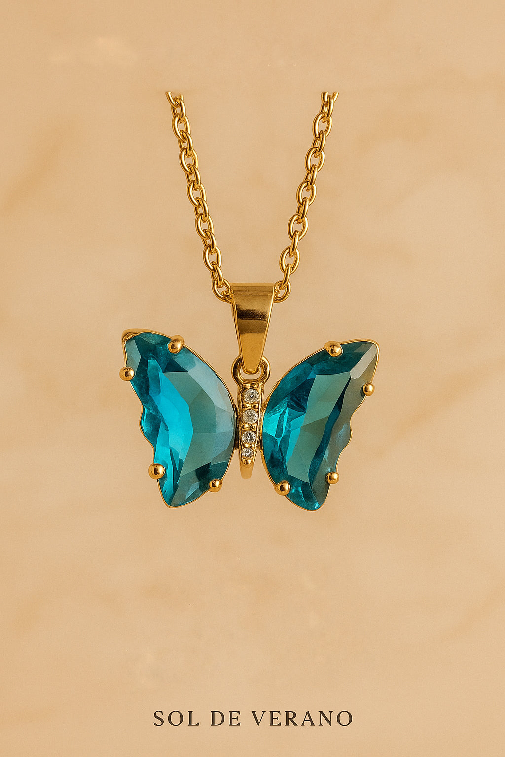 Este delicado collar presenta una mariposa con alas azules traslúcidas, montadas en un fino contorno dorado, y un cuerpo central decorado con piedras simulantes de diamante que capturan la luz con cada movimiento.